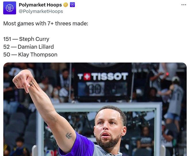 同时本场是库里生涯第151次单场至少命中7记三分,继续断层高居NBA历史第一,第二为利拉德(52),第三为克莱(50)。